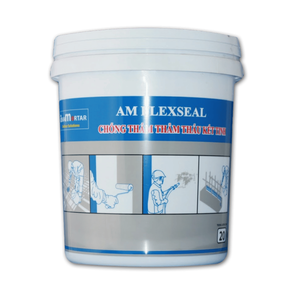 AM FLEXSEAL là vữa xi măng chống thấm thẩm thấu, kết hợp xi măng chuyên dụng, cốt liệu silicat chọn lọc và hóa chất hoạt tính. Khi tiếp xúc với nước, sản phẩm tạo ra tinh thể phản ứng với vôi tự do trong bê tông, hình thành gel lấp đầy mao mạch và lỗ rỗng, giúp chống thấm bền vững, lâu dài.