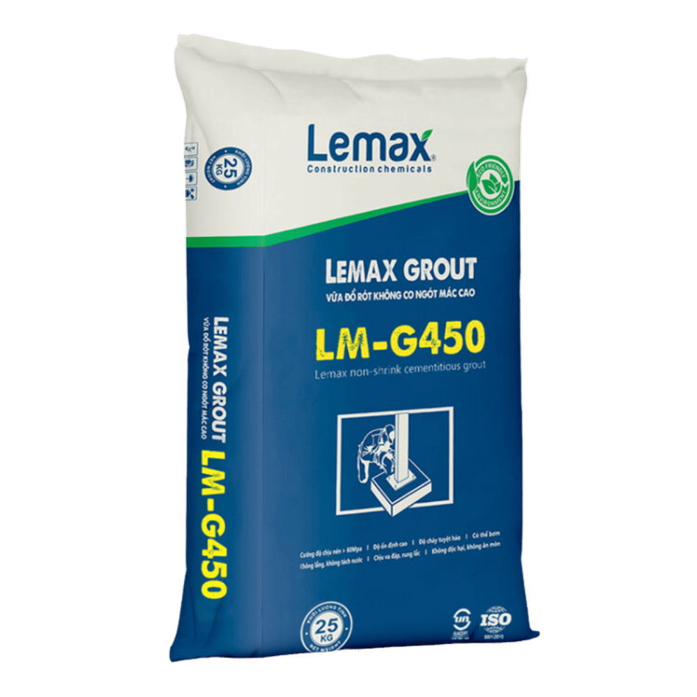 Lemax Grout LM-G450 là vữa rót xi măng không co ngót, cường độ cao, có khả năng tự chảy, dễ bơm, phát triển nhanh, bền vững và an toàn. Sản phẩm lý tưởng để neo bu lông, chèn khe hở, sửa chữa kết cấu bê tông, đế máy, móng và các hạng mục cần chịu tải trọng lớn.