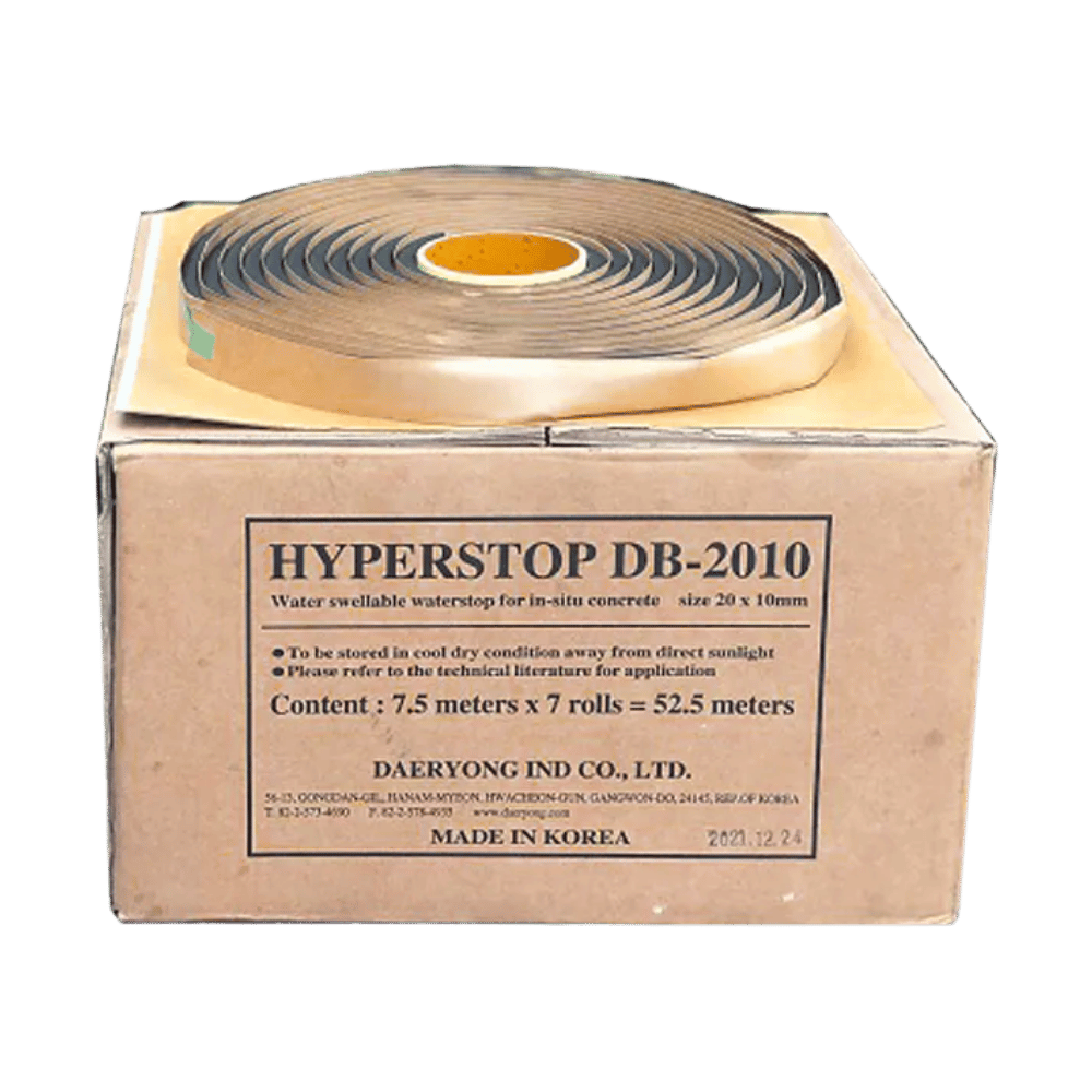 Hyperstop DB-2010 là thanh trương nở gốc bentonite kết hợp cao su butyl ưa nước. Khi tiếp xúc với nước, sản phẩm sẽ trương nở, tạo thành lớp đệm kín ngăn chặn nước thấm qua. Quá trình này diễn ra nhờ phản ứng giữa nước và các nhóm ưa nước trong cấu trúc phân tử, đảm bảo khả năng bịt kín bền vững.